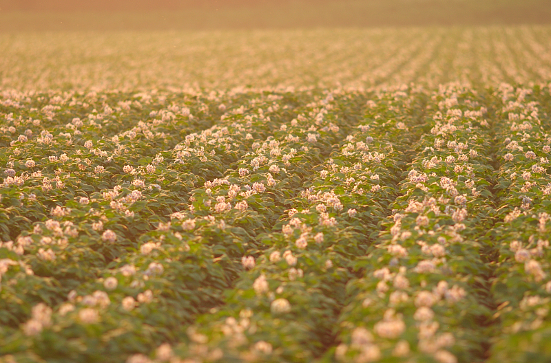 7月。十勝の大地にジャガイモの花が一斉に咲きました。 夕暮れの太陽がイモの花を赤く染めています。