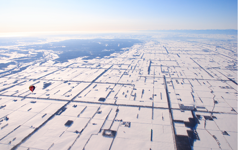 熱気球に乗って空の散歩。高度2000メートル、気温は氷点下25度ですが、それを忘れるほど美しい広い十勝の大地の景色が広がっていました。